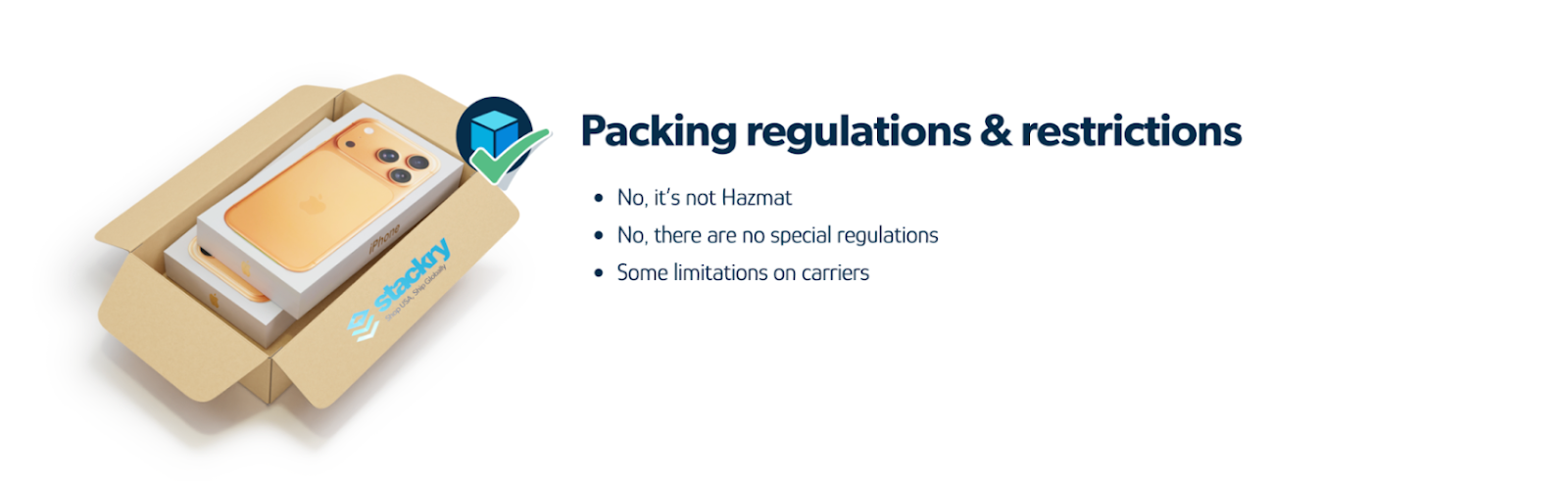 However, if you are shipping three or more iPhones in a single shipment, the consignment is classified as Hazmat. Stackry will follow the required carrier safety procedures, and a one-time $12.50 hazmat handling fee will apply. The items can still be shipped without issue — Stackry manages the entire compliance process on your behalf.
